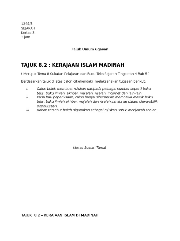 Tajuk 8 2 Kerajaan Islam Madinah 1249 3 Sejarah Kertas 3 3 Jam