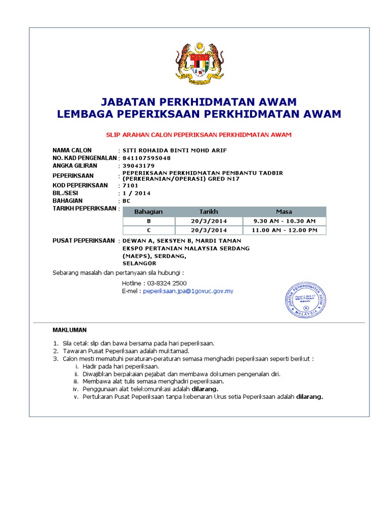 Slip Arahan Calon Peperiksaan Perkhidmatan Awam