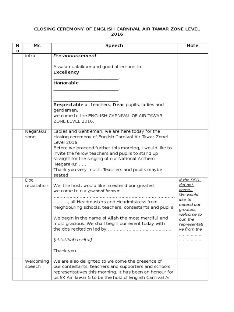 Mc Text Closing Ceremony English Carnival Fiction Literature