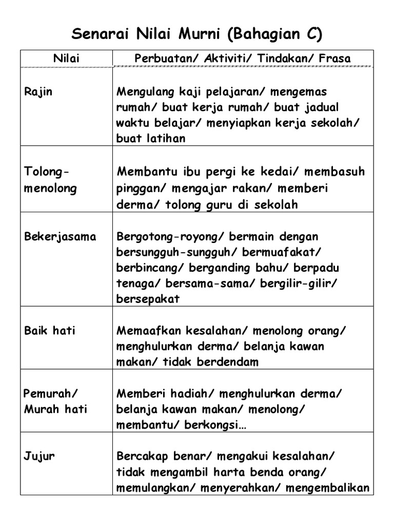 Senarai Nilai Murni Untuk Penulisan Bahagian C