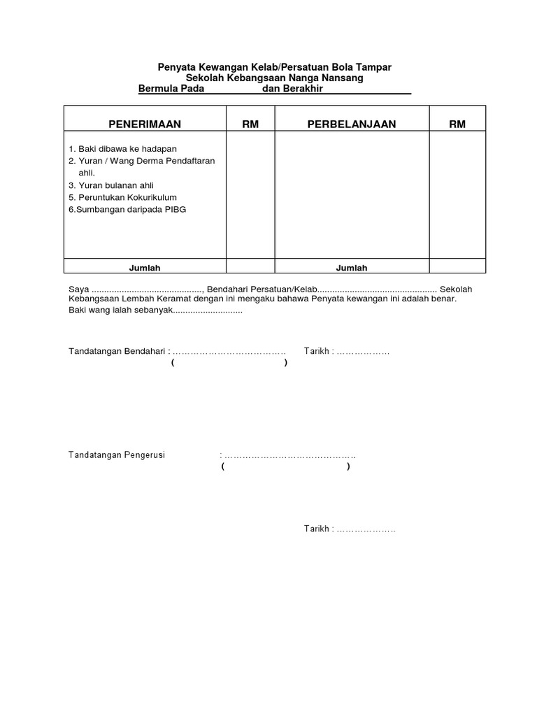Borang Penyata Kewangan Kelab 2014