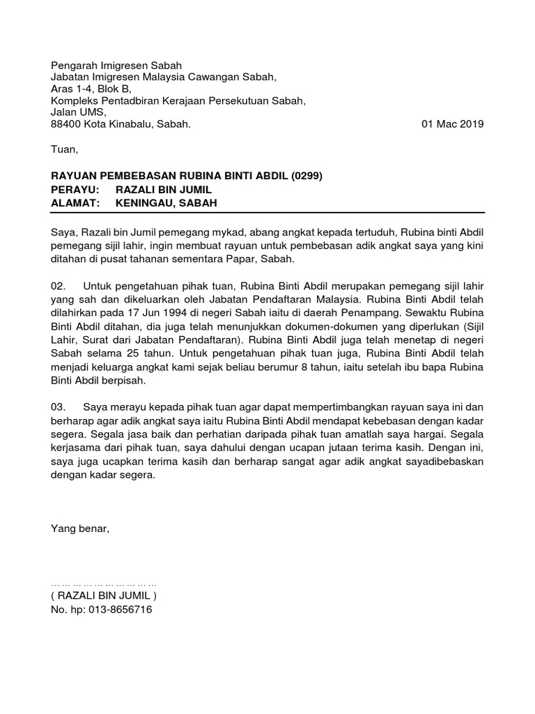 Surat Rayuan Pembebasan Imigresen Docx