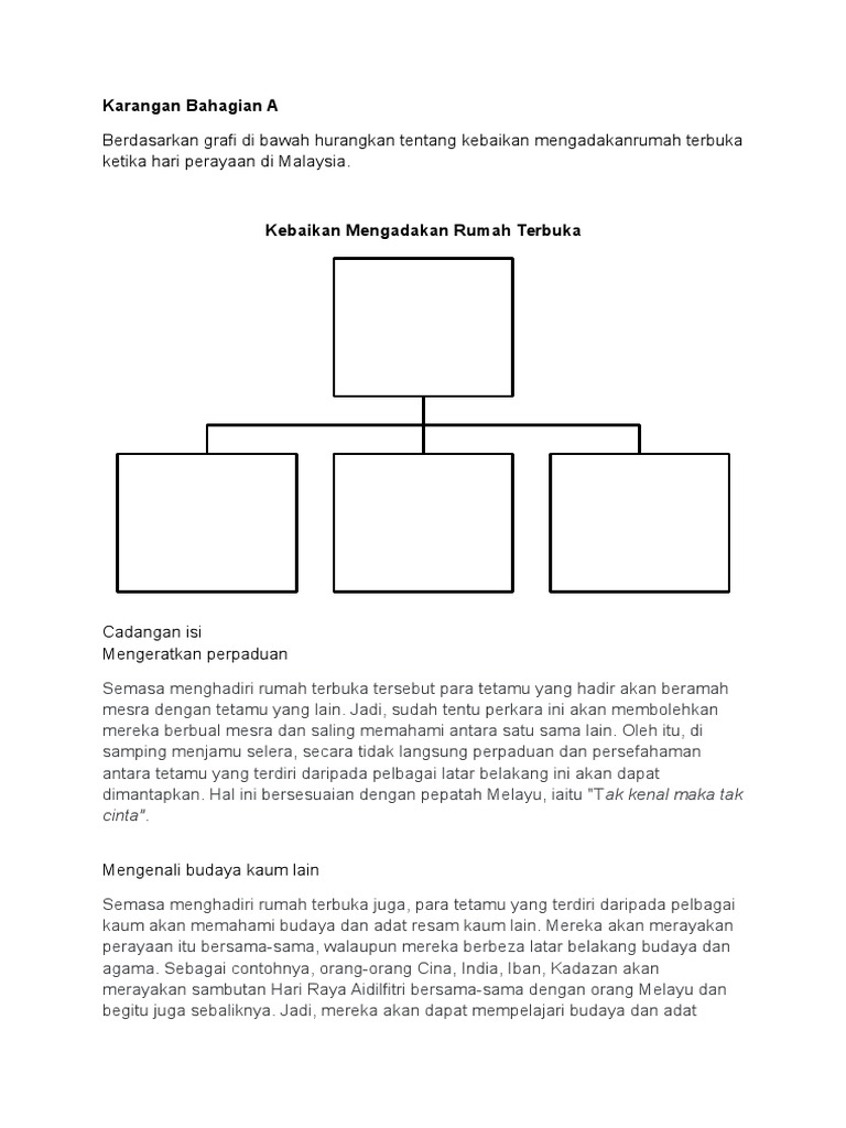 Usaha kerajaan dengan mengadakan majlis rumah terbuka peringkat kebangsaan untuk menyambut perayaan kaum utama malaysia adalah salah satu tindakan yang amat dialu alukan. Sebagaimana yang kita ketahui amalan rumah terbuka dapat mengeratkan perpaduan dan tali silaturahim pelbagai kaum. Isi 1 sebenarnya amalan rumah terbuka yang diwujudkan banyak memberikan kepentingan terutamanya dalam mengeratkan perpaduan kaum dalam kalangan anggota masyarakat di negara kita.