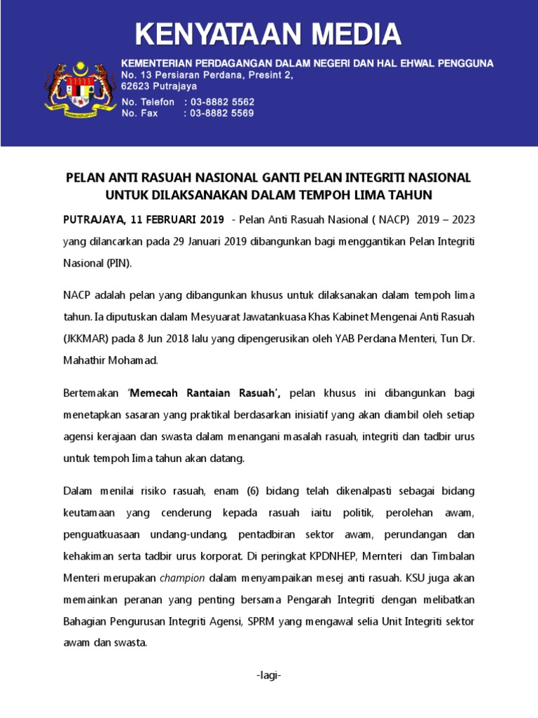 Kenyataan Media Pelan Anti Rasuah Nasional Ganti Pelan Integriti