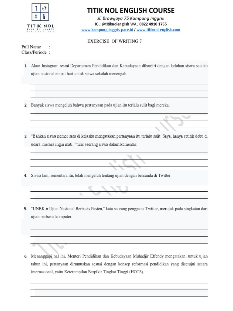 Titik Nol English Course Exercise Of Writing 7 Full Name Class