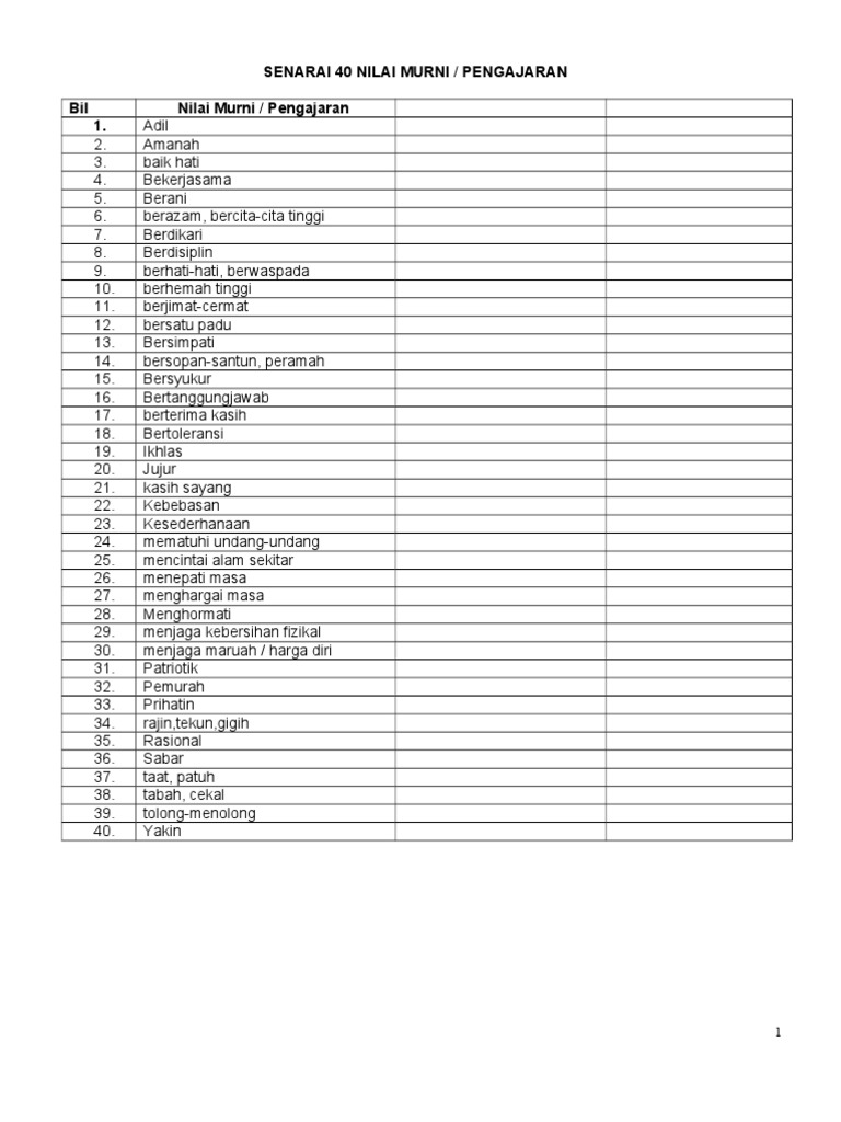 Senarai 40 Nilai Murni Pengajaran Amalan Baik Doc