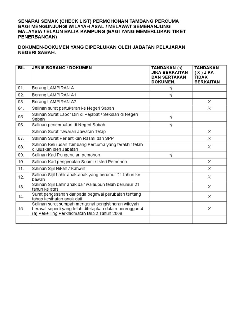 Senarai Semak Permohonan Tambang Percuma