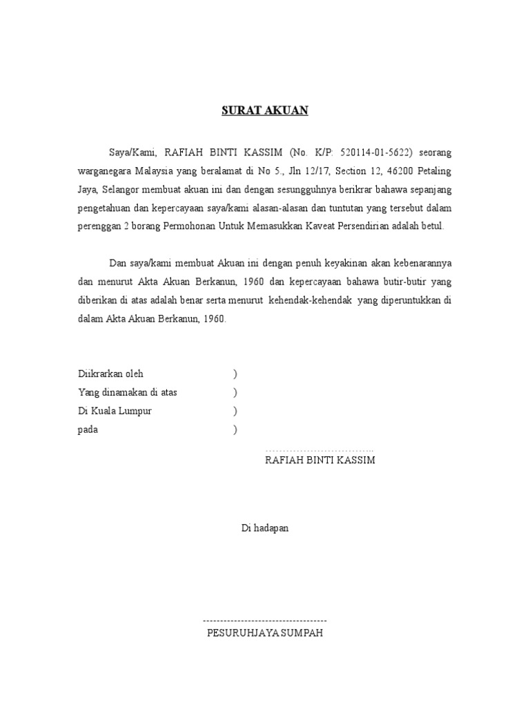 Statutory Declaration Contoh Surat Akuan Kaveat