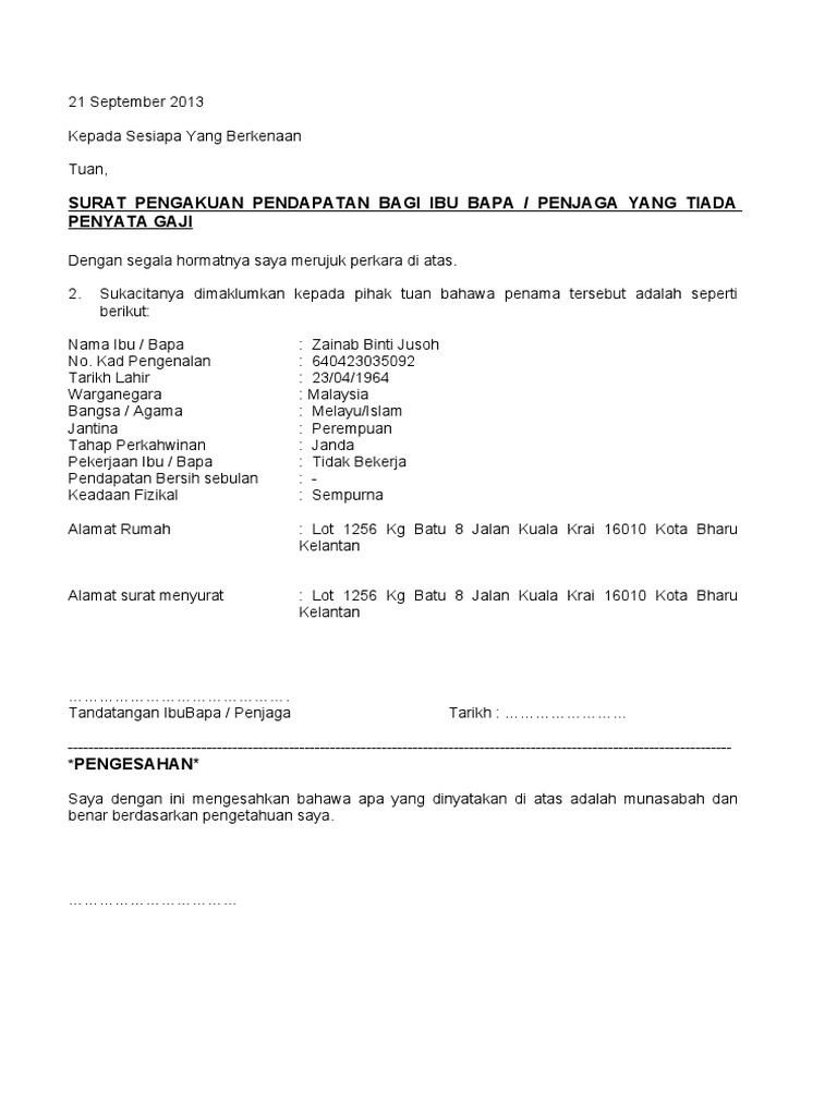 Surat Pengakuan Pendapatan Bagi Ibu Bapa Penjaga Yang Tiada
