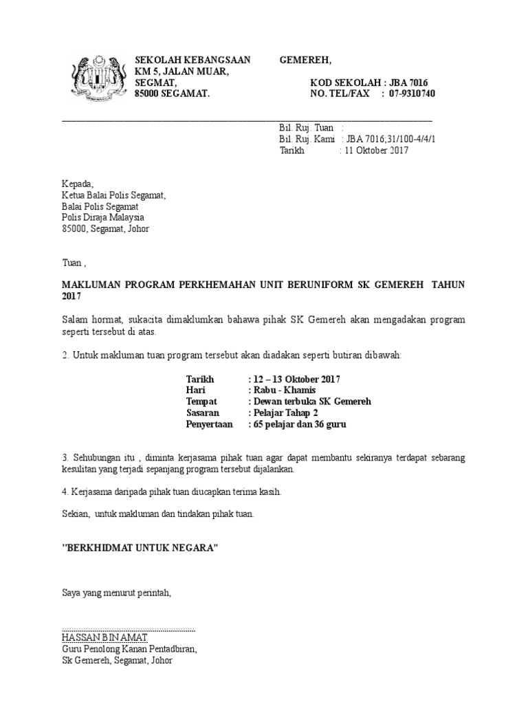 Contoh Surat Makluman Aktiviti Kepada Pihak Polis
