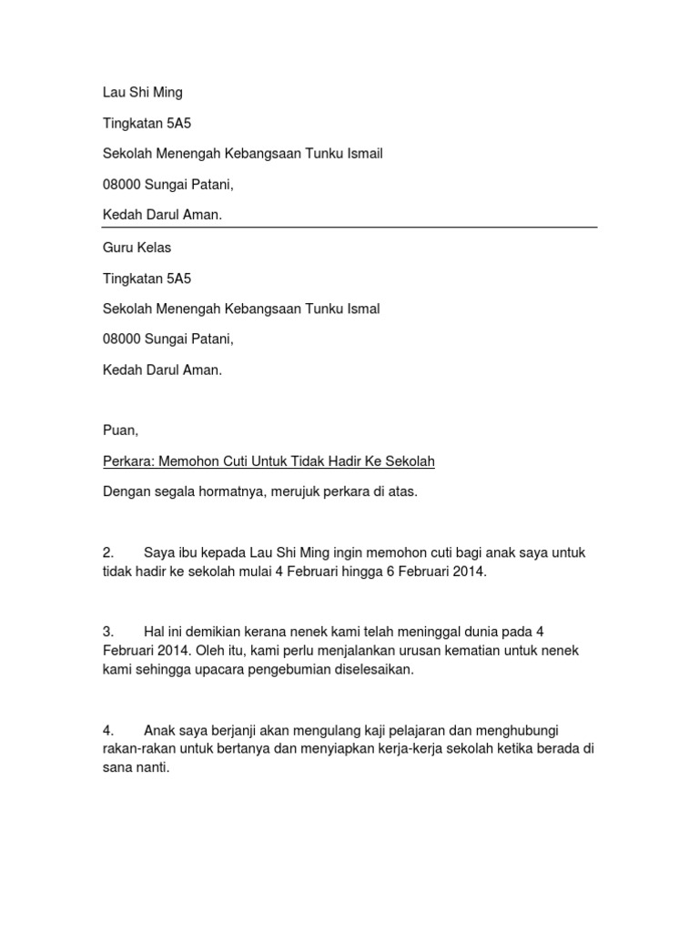 Contoh Surat Rasmi Tidak Hadir Ke Sekolah Kerana Kematian