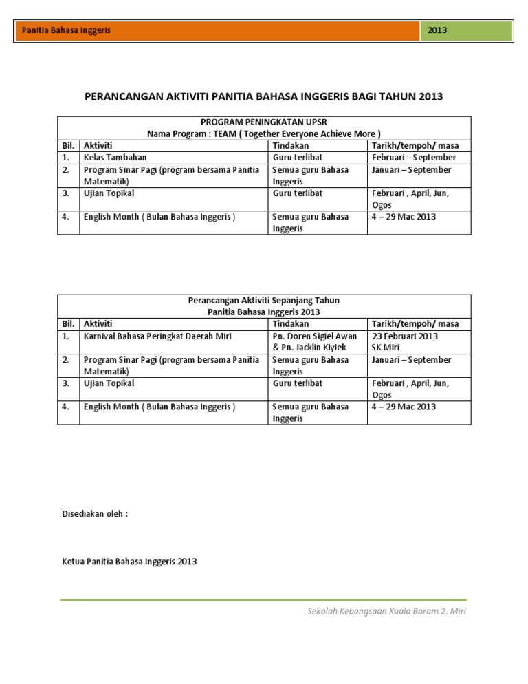 Perancangan Aktiviti Panitia Bahasa Inggeris Bagi Tahun 2013