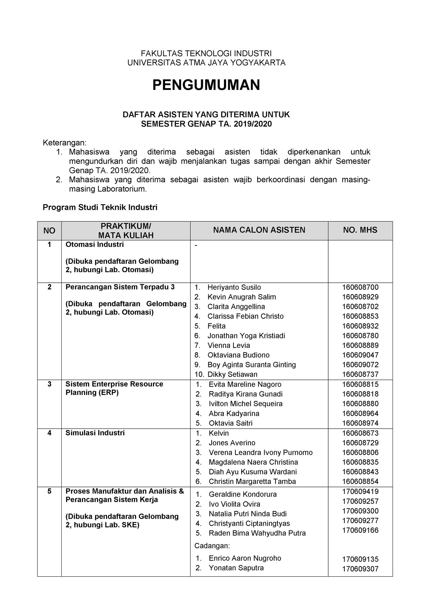 Fakultas Teknologi Industri Uajy On Twitter Info Asisten 2019 2
